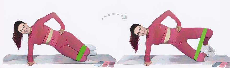 - Отведи верхнюю ногу в сторону, растягивая фитнес резинку до момента, когда почувствуешь напряжение в ягодичной мышце. При этом сохраняй ровное положение тела, чтобы корпус был вровень с тазом.