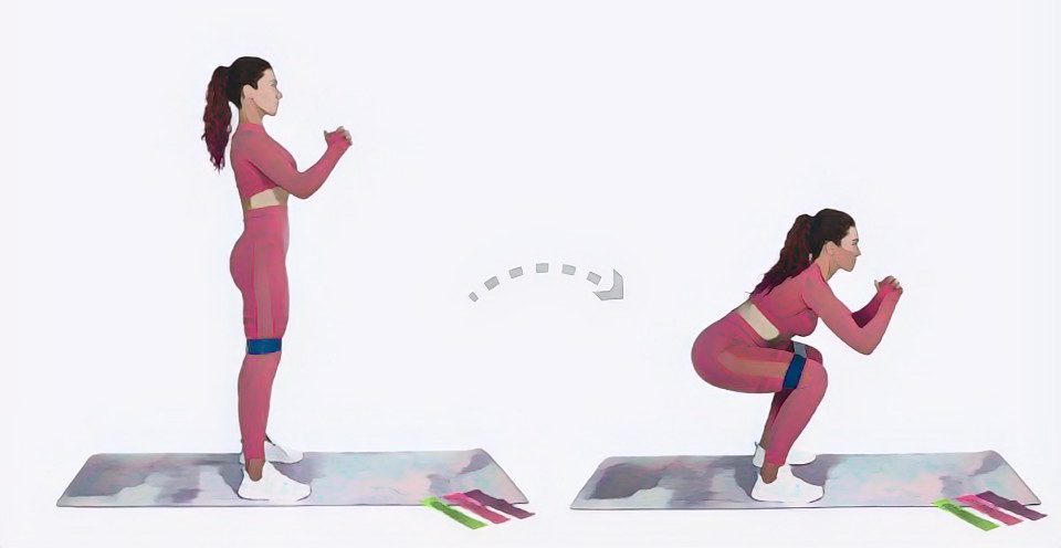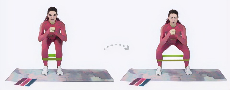 - Фитнес резинка должна быть на бедрах чуть выше колена, ноги нужно расставить так, чтобы она немного натянулась.