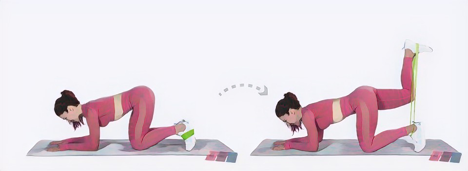 - Медленно отведи одну согнутую ногу назад, чтобы она поднялась вверх. Задержись в конечной точке на секунду, чтобы почувствовать натяжение мышц. После этого вернись в стартовое положение.